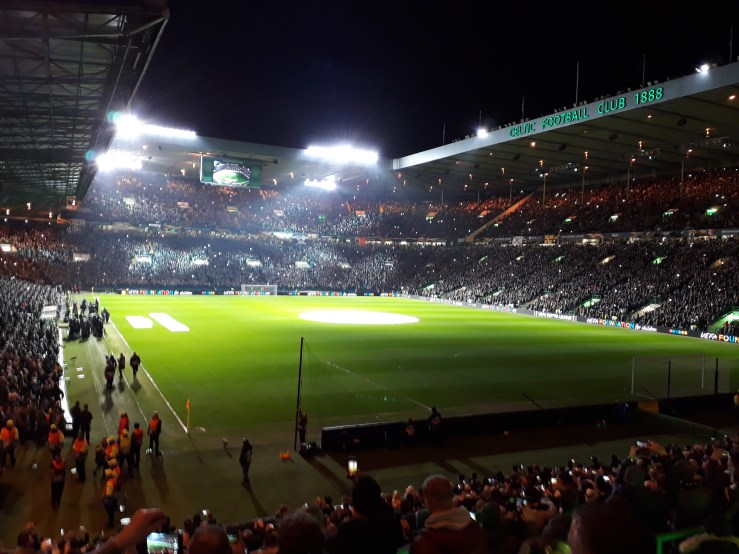 The remainder of the near 60,000 crowd seemed to be bedecked in green and white and, as I had expected, the atmosphere created as the minutes ticked down to kick-off was electric. It can only be a totally emotionless person who is not affected by the Celtic fans’ passionate pre-match rendition of You’ll Never Walk Alone. As ever, it would be a test of the skill and character of the visiting players – and officials – to perform to the best of their abilities. (As it turned out, the referee – Ovidiu Hategan of Romania – also had an excellent game).
